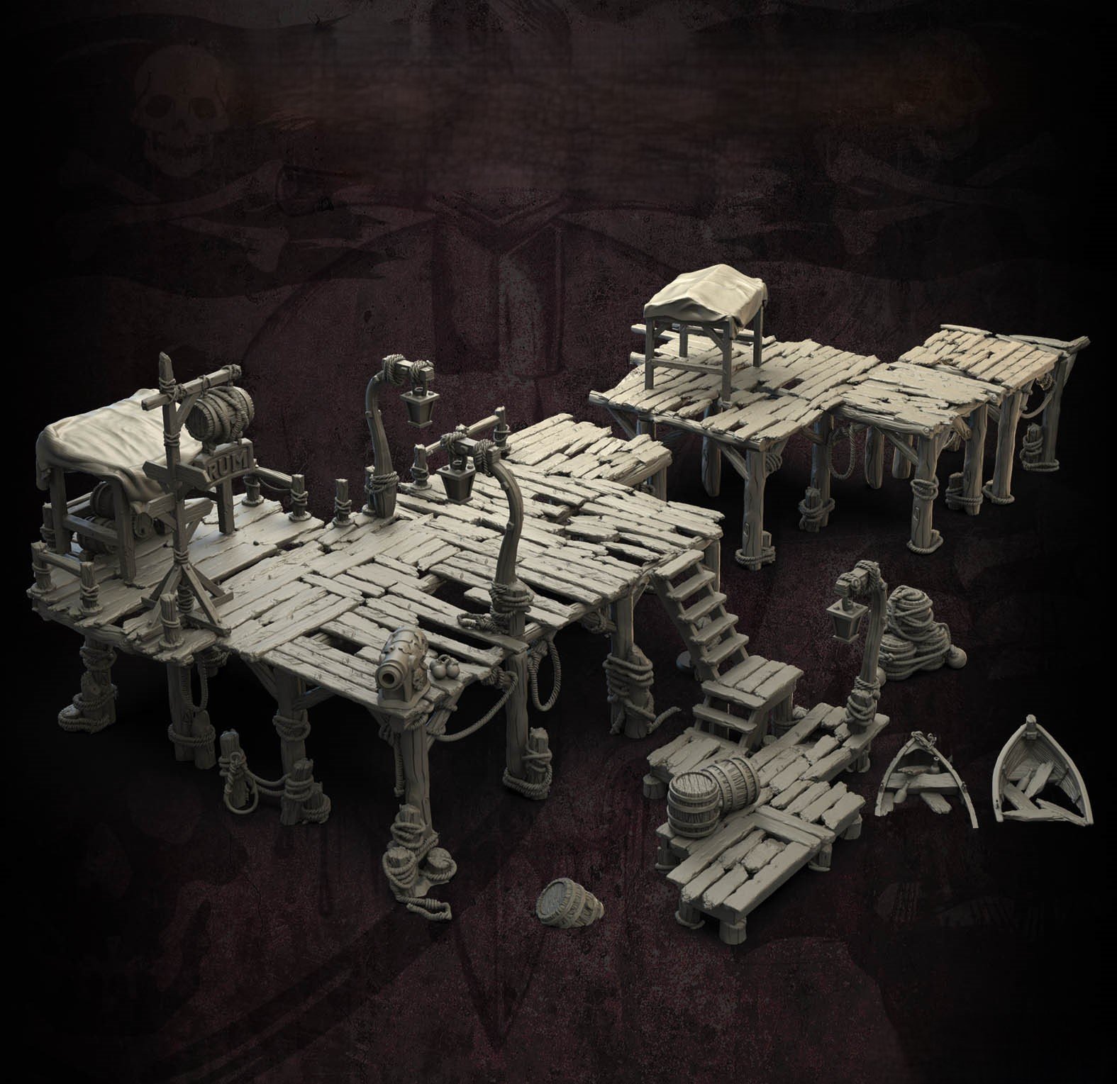 Modular dockyard terrain set, perfect for pirate, harbor, and coastal tabletop scenes.