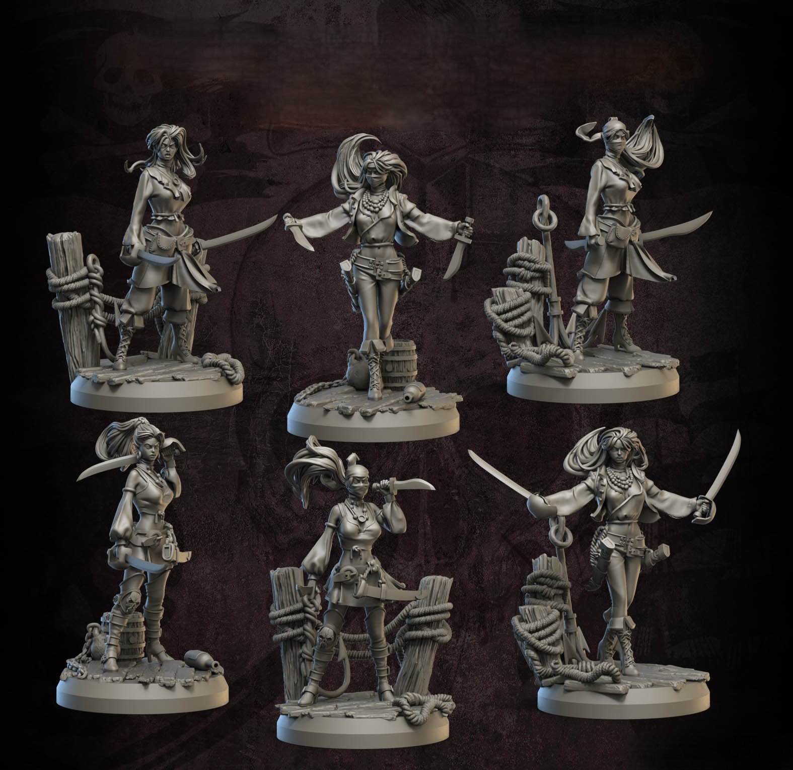Set of dynamic female pirate miniatures, perfect for ships, docks, and pirate adventures.