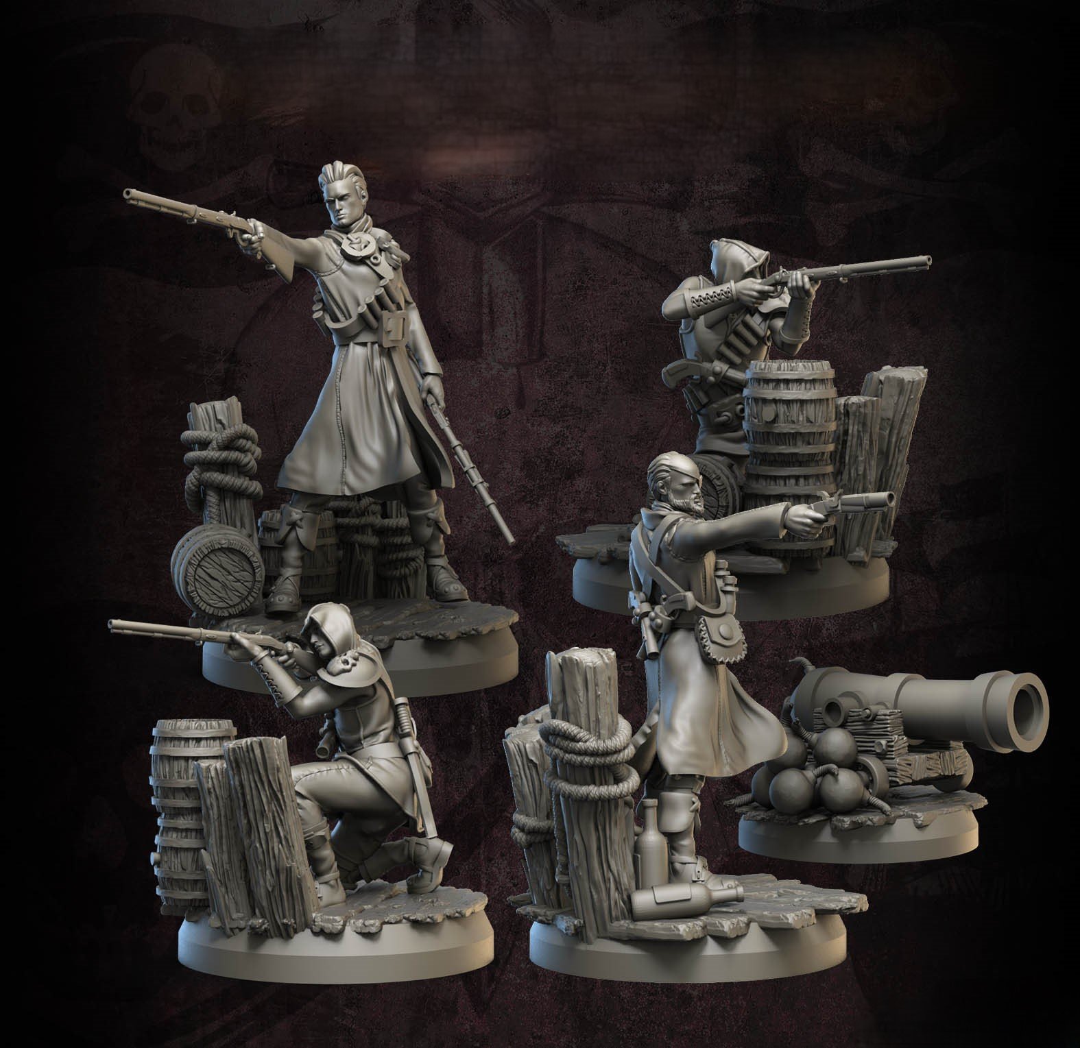 Male pirate gunners with muskets and cannon, ideal for ranged combat and naval encounters.